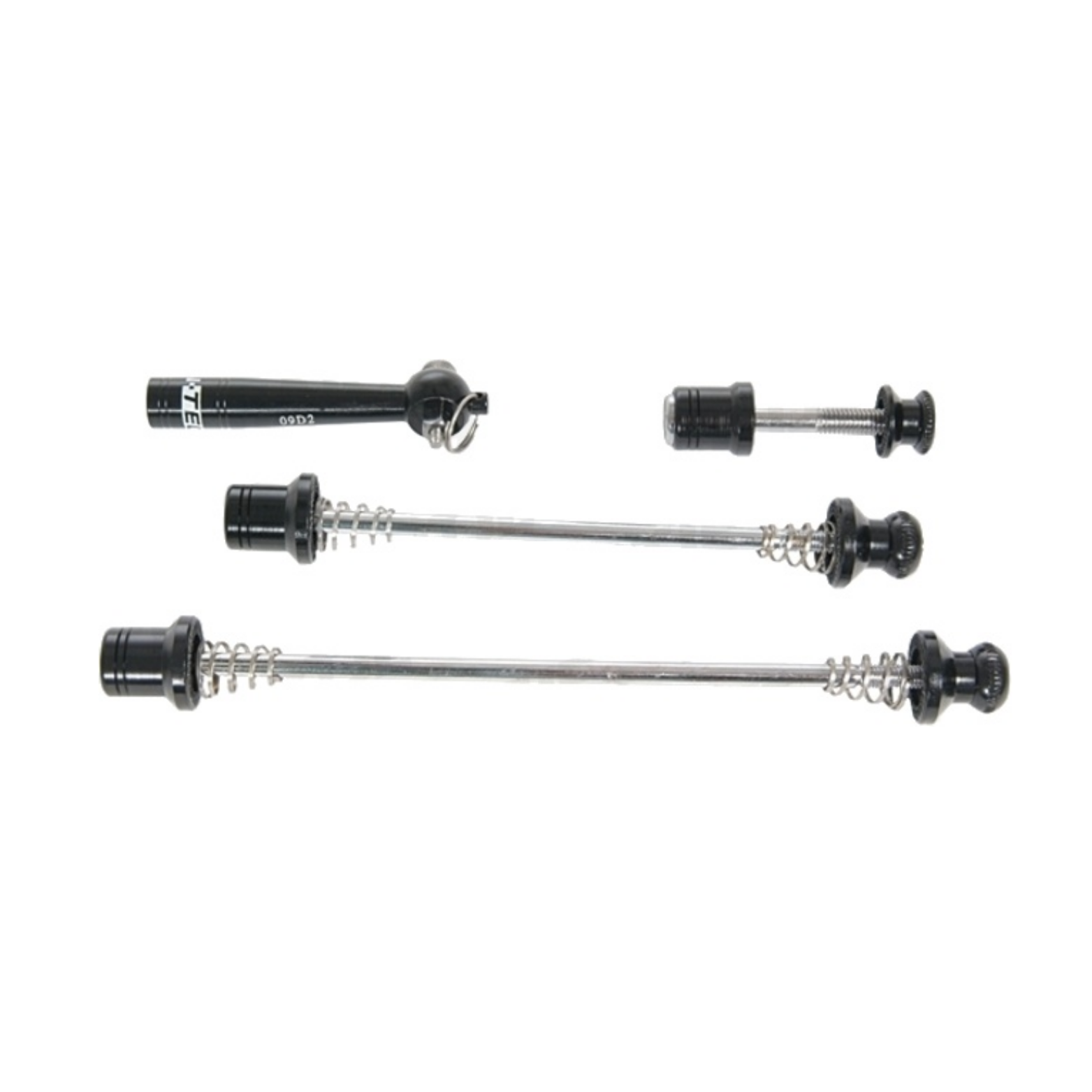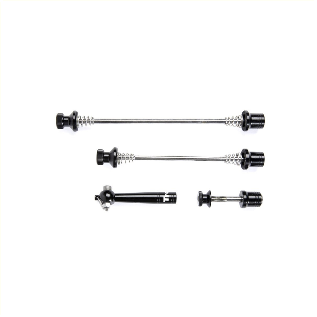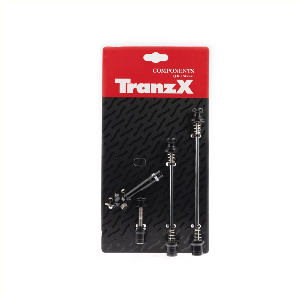 Komplettes Schnellspannset von Tranz X für Vorderrad, Hinterrad und Sattelstütze. Ausgestattet mit speziellen Inbusschrauben zur Diebstahlsicherung (Schlüssel im Lieferumfang enthalten).