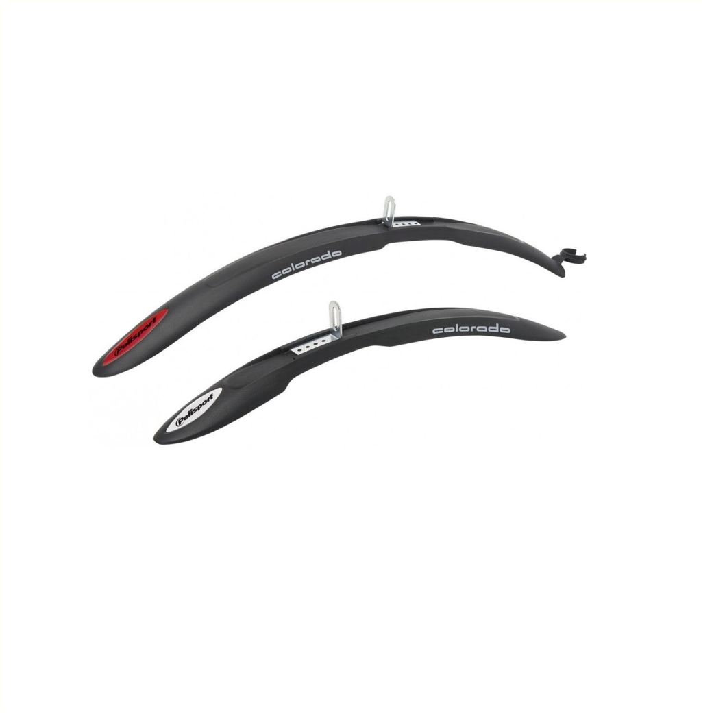 Das Polisport Colorado Kotflügelset für 24 und 26 Zoll ist vorne und hinten mit sicheren Reflexionsaufklebern ausgestattet. Der hintere Kotflügel ist für Rahmenrohre von 27 bis 35 mm Dicke geeignet -