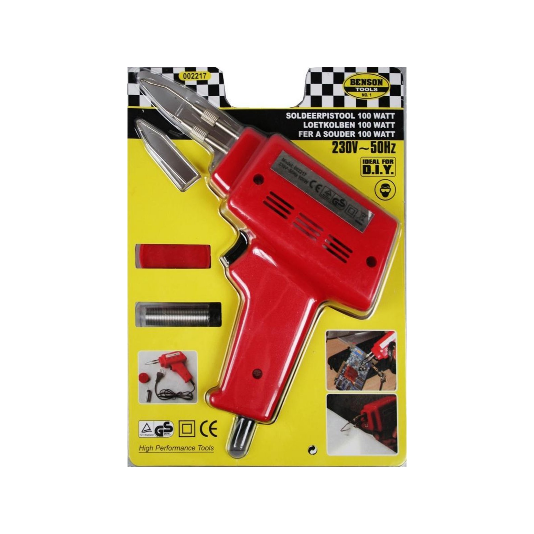 Elektrische soldeerpistool • Geschikt voor het solderen maar ook voor het graveren van hout en leer • Vermogen: 100 W Set bestaat uit • soldeerpistool • 3 verwisselbare dubbele soldeerstiften • soldeerpasta en soldeertin
