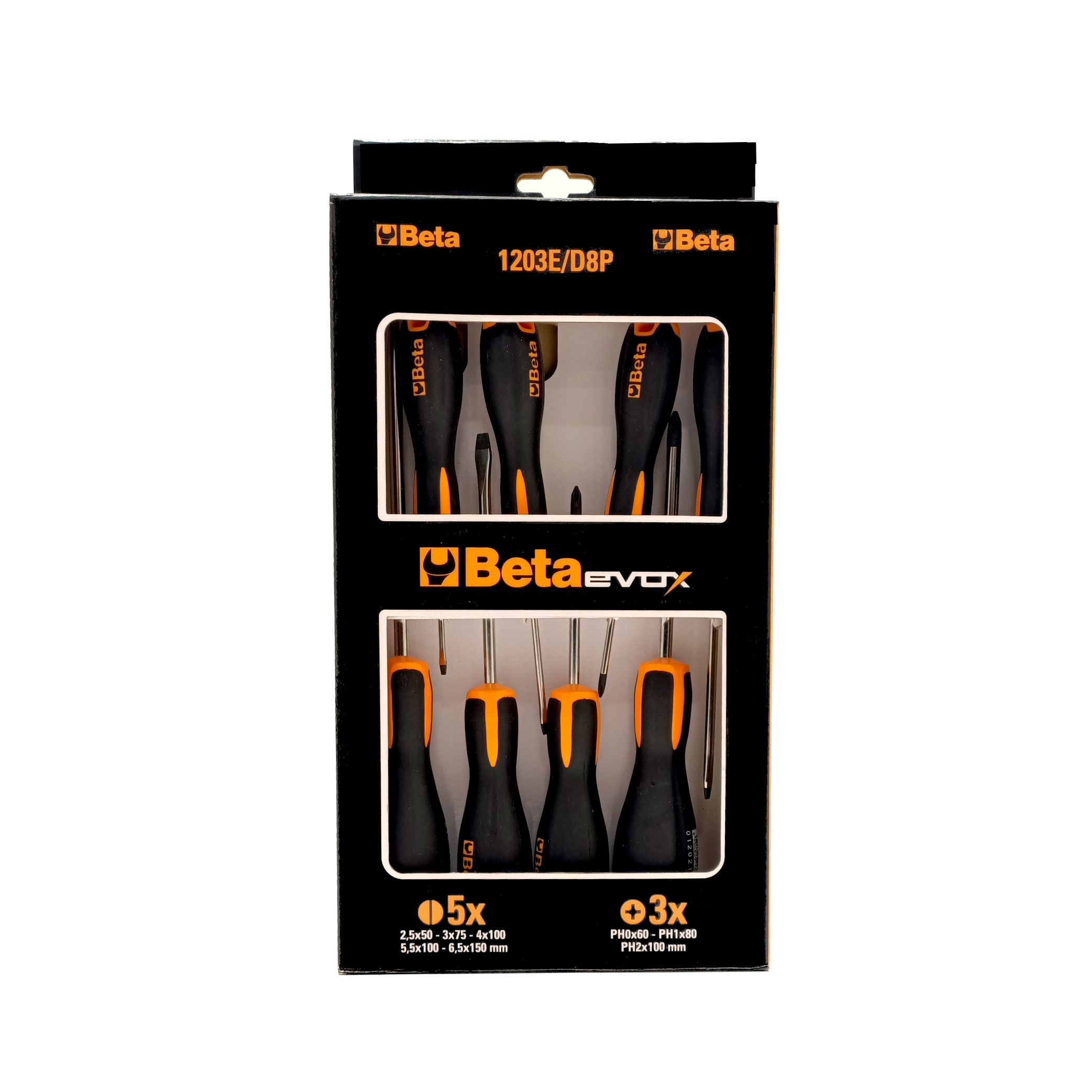 Beta Schraubendrehersatz 8-teilig • Schlitzschraubendreher: 2,5x50, 3x75, 4x100, 5,5x100, 6,5x150 • Kreuzschlitzschraubendreher: PH0X60, PH1X80, PH2X100