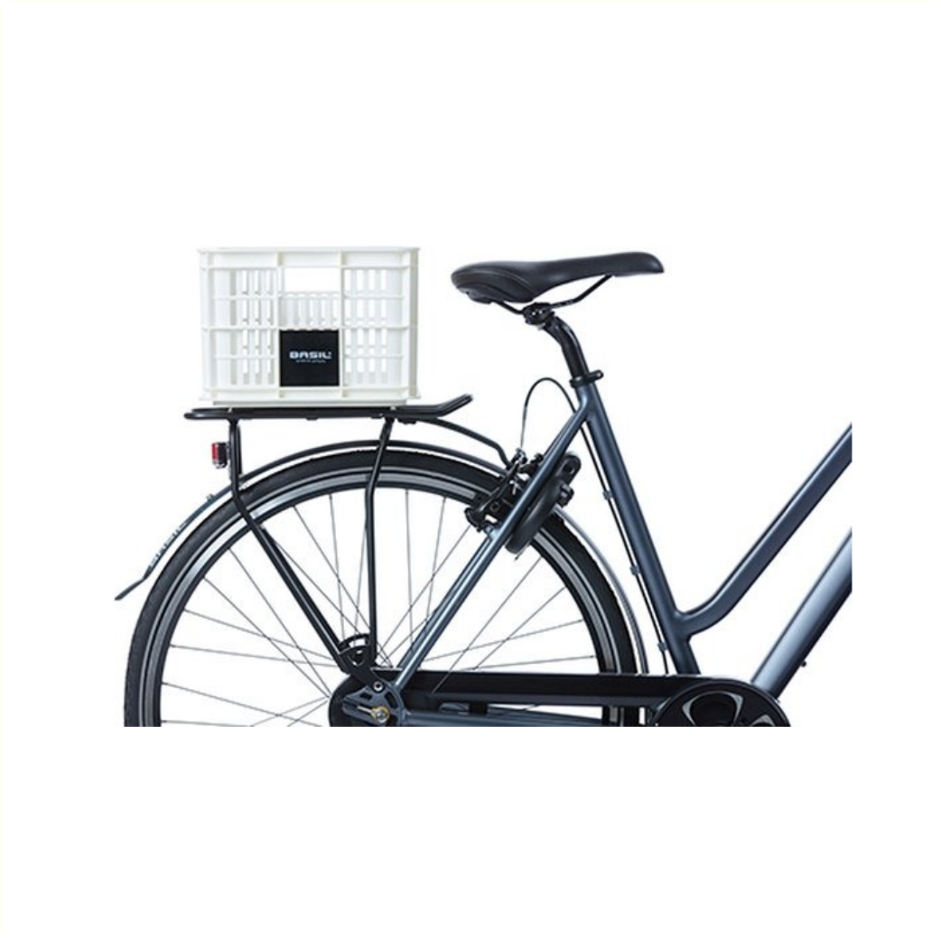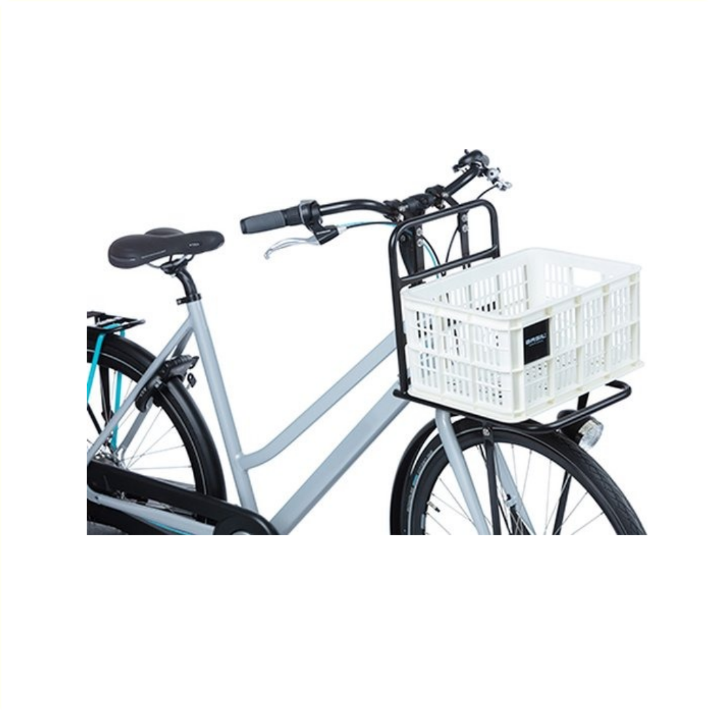 Die Basil Fahrradkiste in Größe S ist eine weiße Fahrradkiste für ein Damen-, Herren- oder Kinderfahrrad.